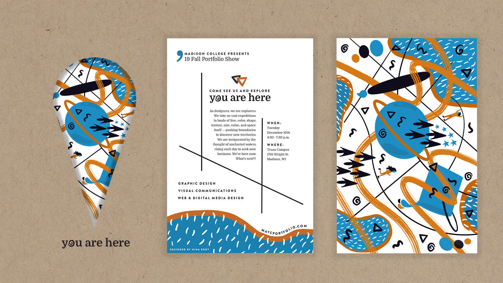 The Fall of 2019 portfolio show branding, You Are Here is about the exploration of design. How we as designers are constantly brainstorming, exploring, and pushing different design elements until we finally get that delightful ‘Ope wait! That’s it! We’ve got a little something we can work with here…’ moment.