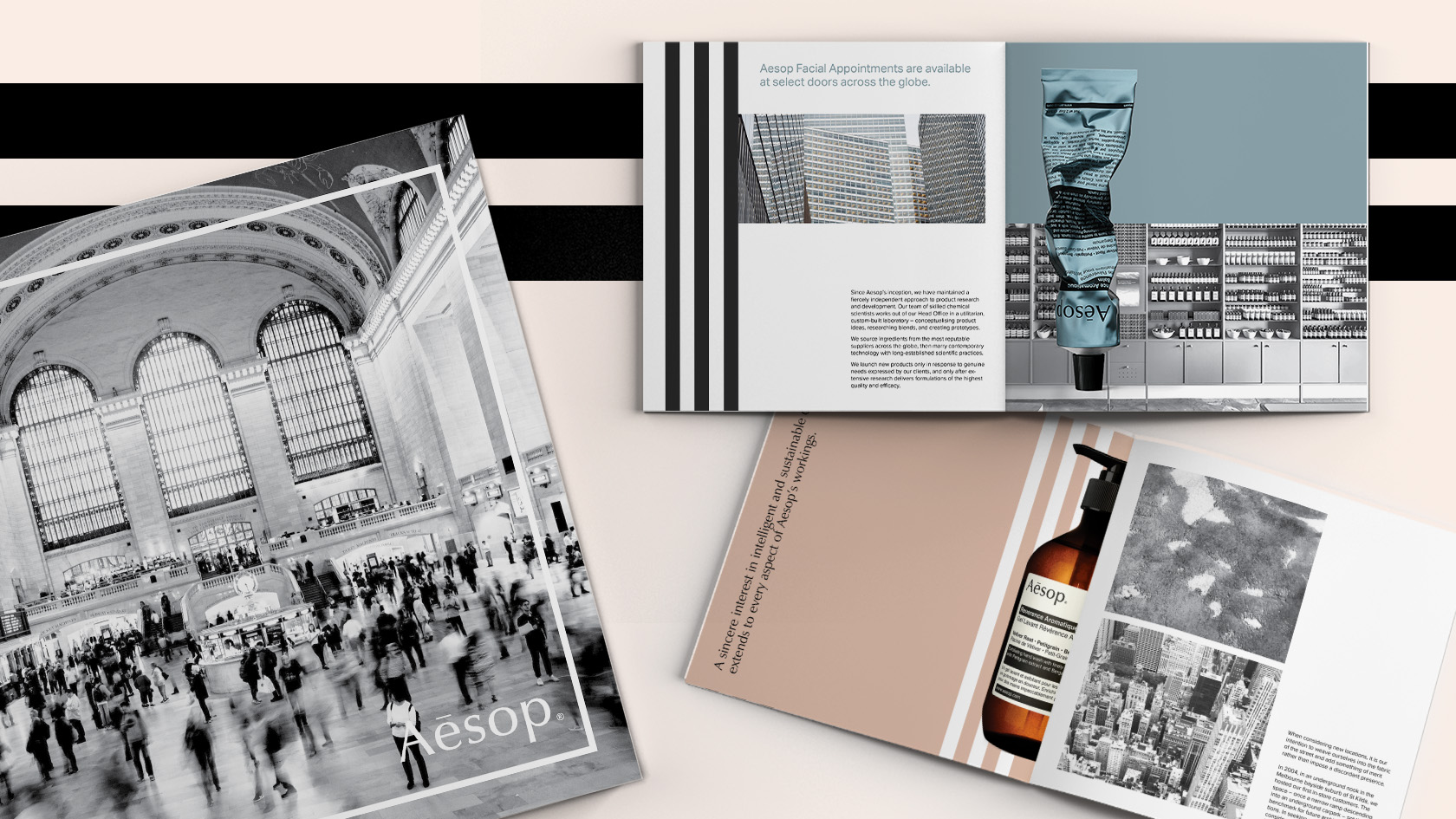 Aesop is an Australian luxury skin care brand that produces skin and hair care products, soaps and fragrances. Each Aesop store has a strong identity in design which makes them unique. This brochure explains their philosophy for consumers in New York City.