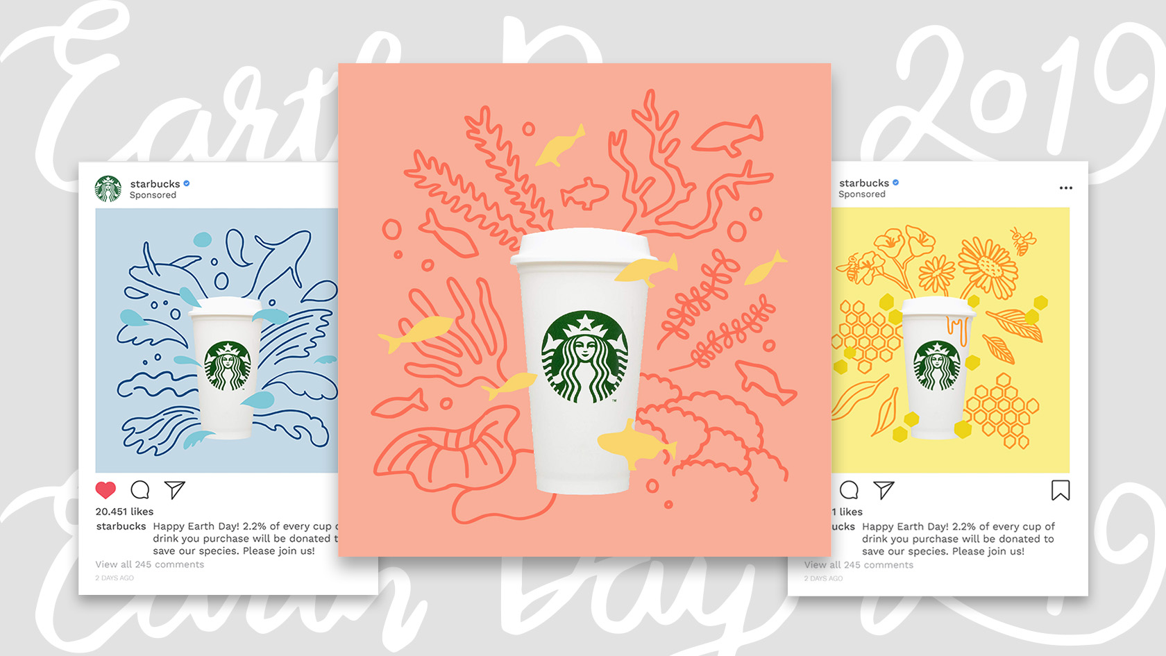Protect our species. This campaign is to celebrate Earth Day 2019 and to get the word out to people to join the Protect our Species campaign. To participate in this campaign, Starbucks donates 2.2% of all sales they make on Earth Day, April 22nd.