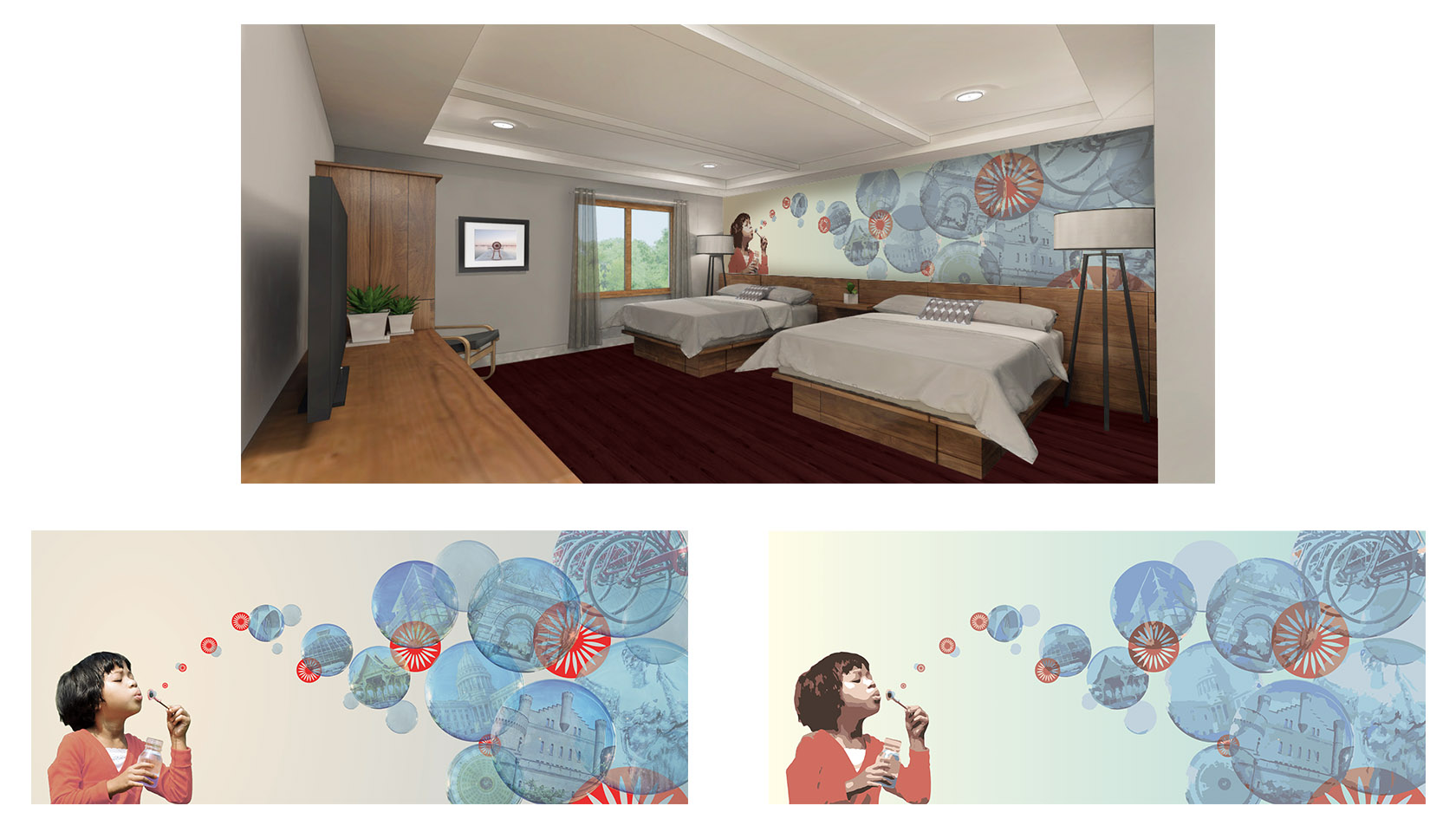 This mural was an entry in the Creative Arts Collective's Mural in a Day Design Contest. In the contest artists were given a theme and six hours to create at least one design to submit. The theme that contestants had to work with was the city of Madison itself because the finished product was going to decorate the walls of the Madison's Ronald McDonald House once its expansion construction was complete. I was hoping to create something that really captured the innocence of childhood while still related to the city. Constructed using Illustrator and Photoshop.